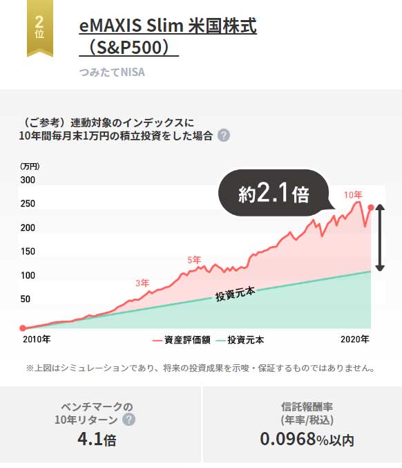 もう1つ人気のファンド「eMAXIS Slim米国株式(S&P500)」に10年間積み立てした場合は、投資元本に対して評価額は約2.1倍となります。